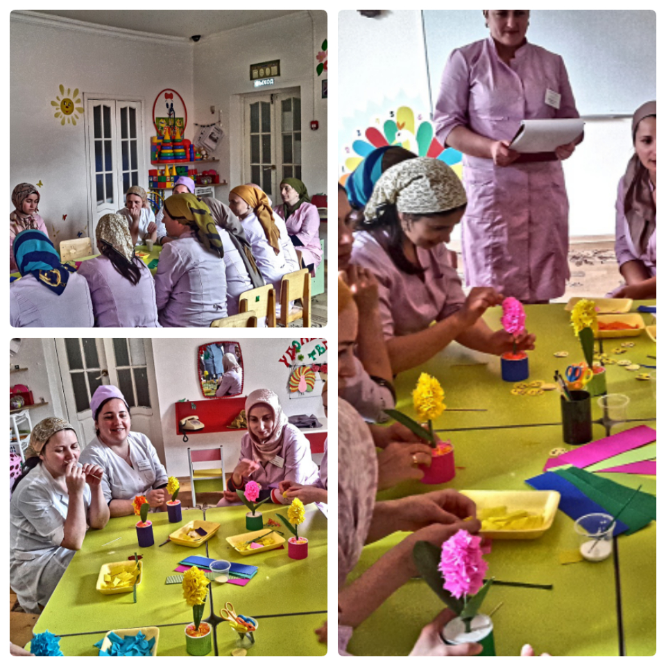 В МБДОУ №1 «Шовда» воспитатель старшей группы «Пчелки» Илисханова С. Я. провела мастер – класс для педагогов по теме: «Бумагопластика как средство развития мелкой моторики и творчества дошкольников»